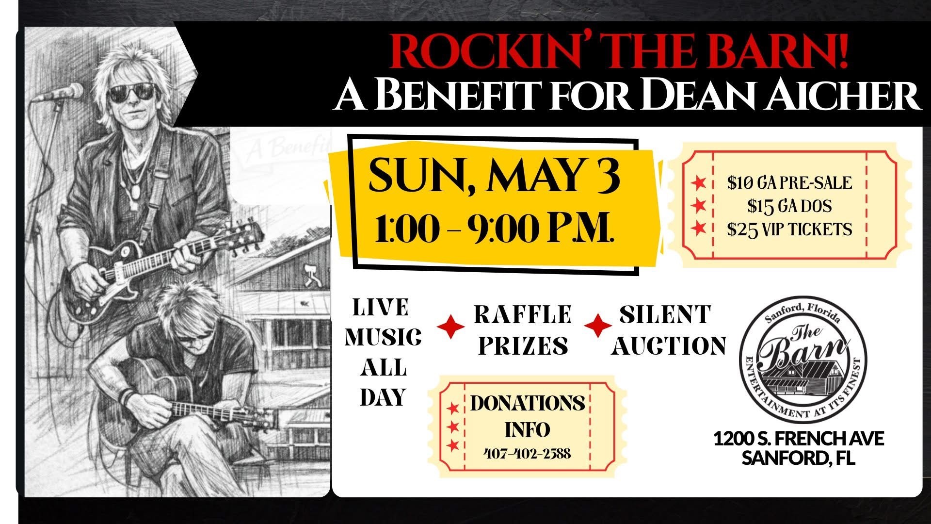 Join us at The Barn in Sanford for a special all-day live music benefit on Sunday, May 3. From 1:00 PM to 9:00 PM, enjoy continuous live performances, plus raffle prizes and a silent auction, all in support of a great cause.